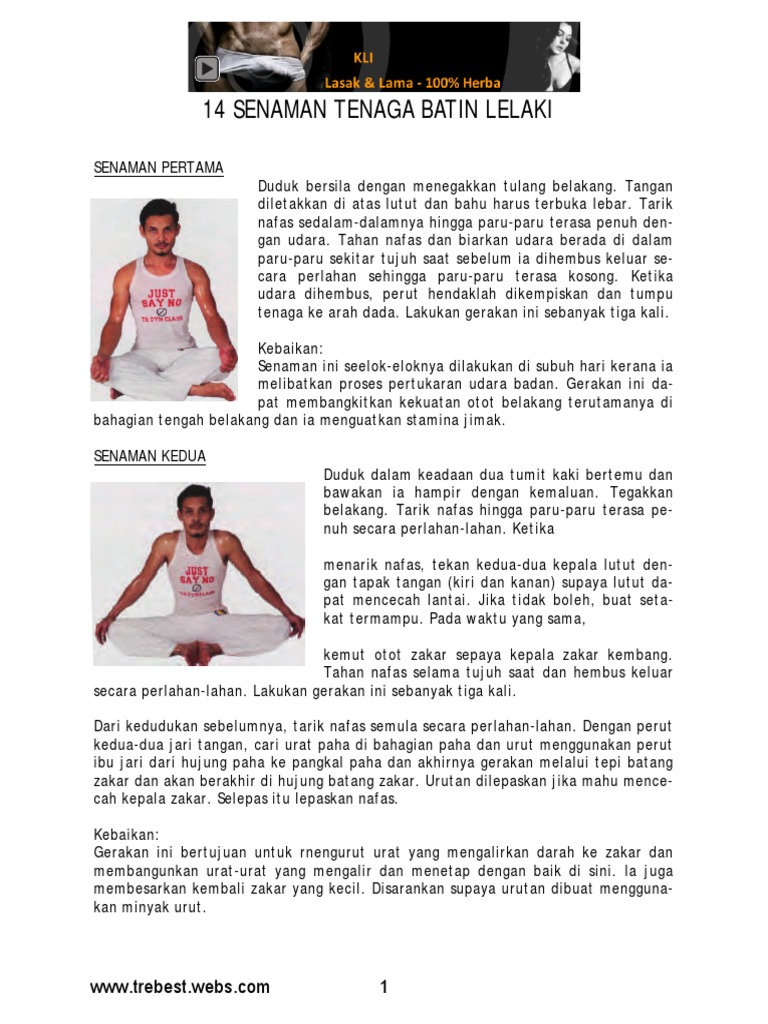 Pelbagai petua pantang larang telah diajarkan oleh orang-orang tua Melayu bagi menjaga kesihatan tenaga batinIa bukan bertujuan mengharamkan yang halal tetapi berupa nasihat hasil dari pengalaman. Senaman untuk menguatkan tenaga batin lelaki caranya ialah. Diharap anda yang lelaki dapat memanfaatkannya pada jalan yang betul ya.